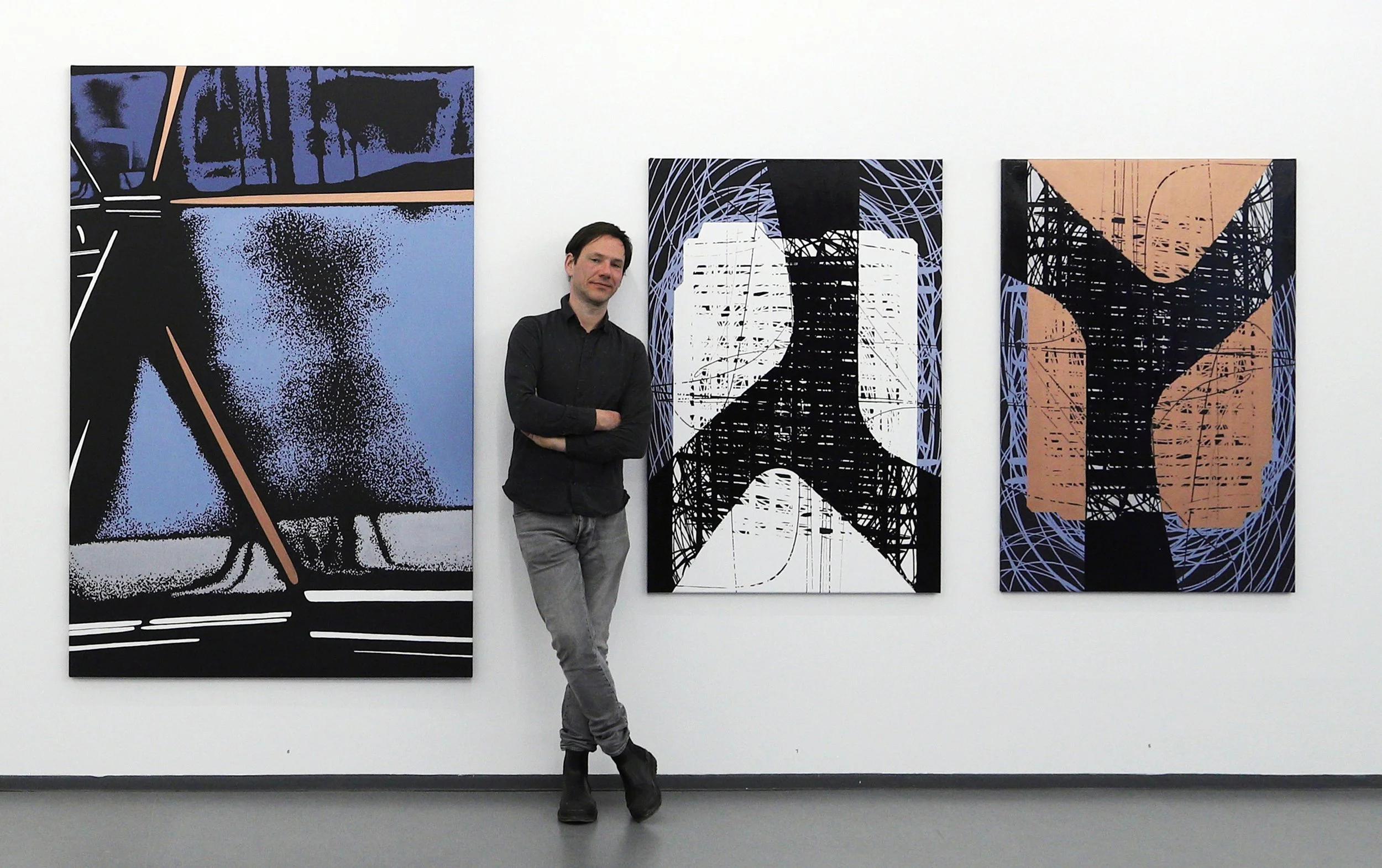 95 x 65 cm / 95 x 65 cm / 130 x 190 cm. Acrylic (rolled, painted, screenprinted, dripped) and marker / clear-paint (partially painted) on canvas.